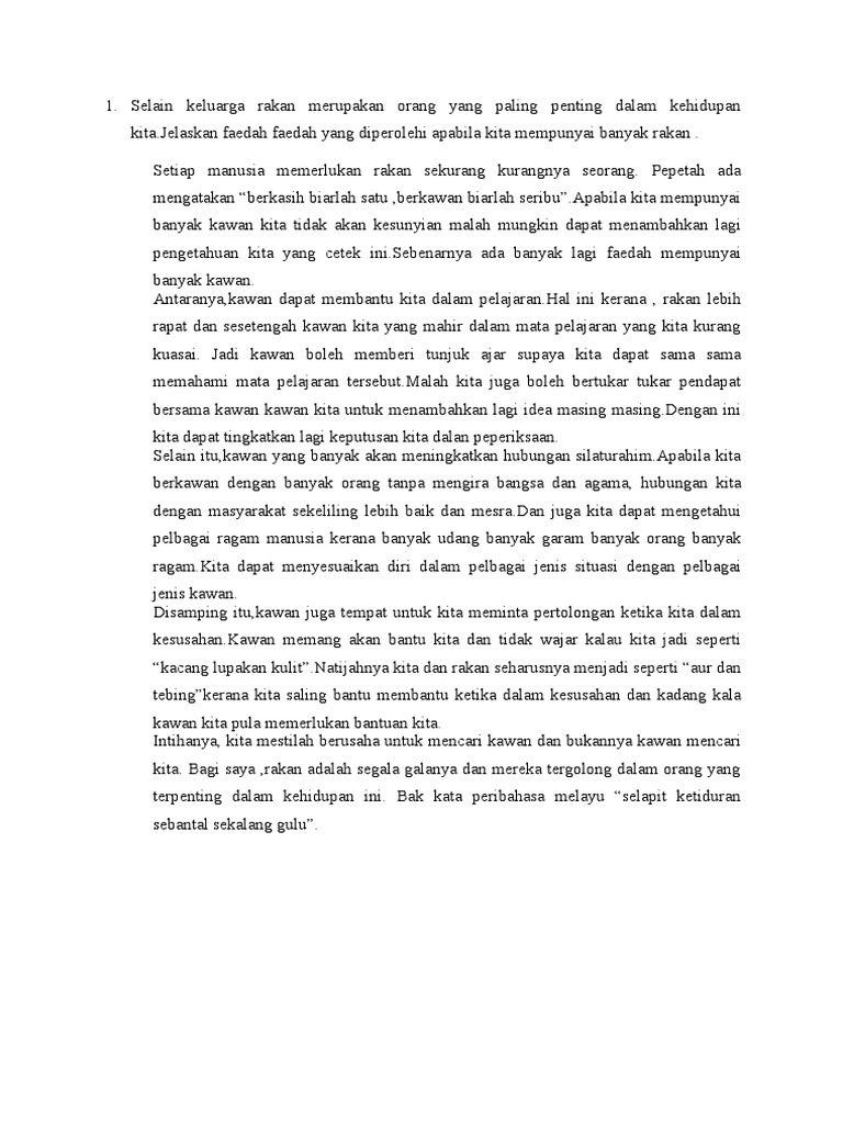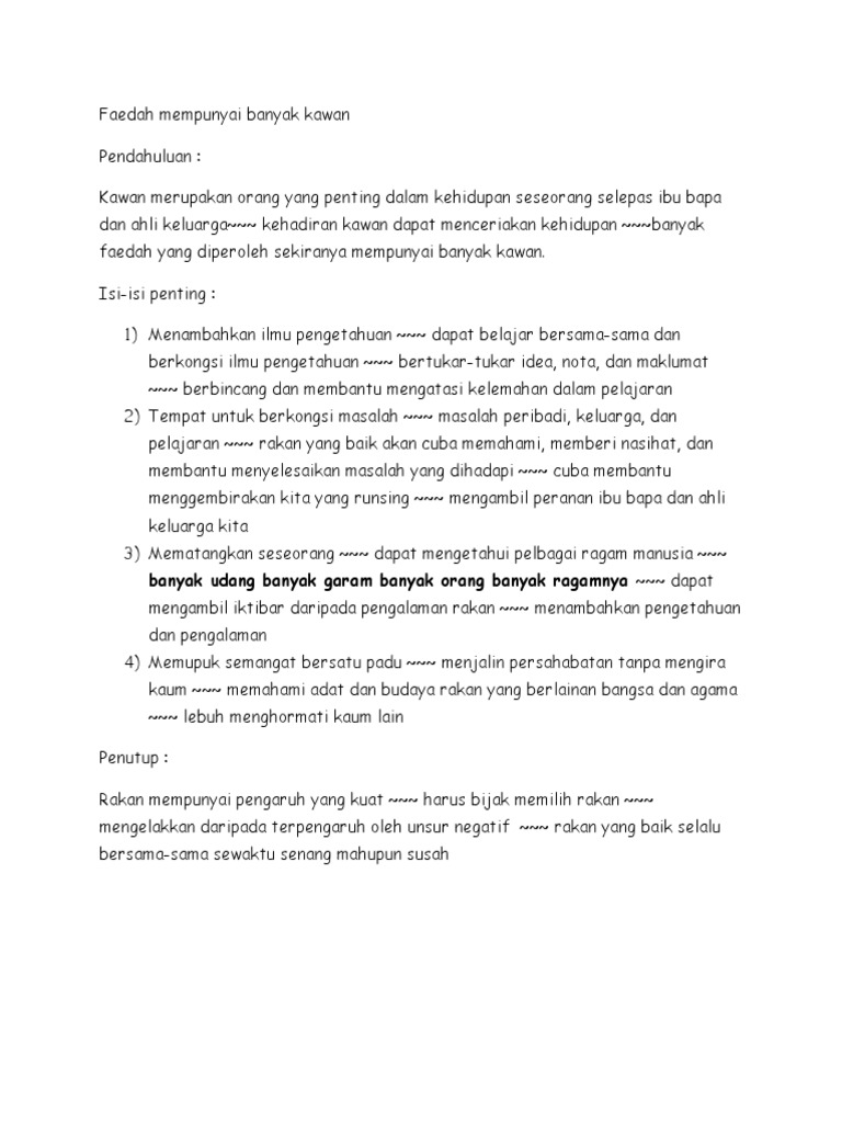 Kawan ketika senang mudah dijumpai tetapi kawan ketika kita berada di dalam kesusahan itulah yang susah dicariKebanyakan kawan-kawan yang ada hanya berada dengan kita semasa kita mempunyai sesuatu sama ada jawatan pangkat harta dan kedudukan dan mereka akan meninggalkan. Faedah mempunyai kawan yang banyak kerangka karangan karangan pt3 penulisan pt3 tajuk lisa pt3. Mempunyai masa sendiri Apabila berniaga boleh meluangkan masa bersama keluarga atau kawan-kawan sekiranya perniagaan anda dijalankan dengan baik.